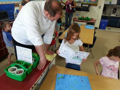 We started off in Sage’s 4th grade classroom. I was so impressed with her writing! Here she is going over it with Tom.