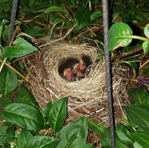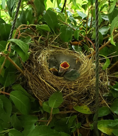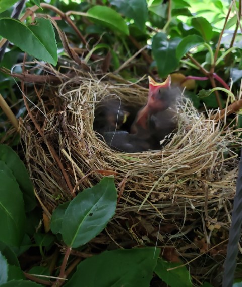 Last month, my friend Linda gave us a beautiful hanging flower pot. Little did she know that a bird would choose to build a nest in it and we would get to enjoying seeing 4 baby birds grow. None of us have ever seen that before and it has been so much fun to watch! They are growing so fast and the parents are going crazy bringing them food constantly. Tom has enjoyed watching it from his desk in the front room as he works!