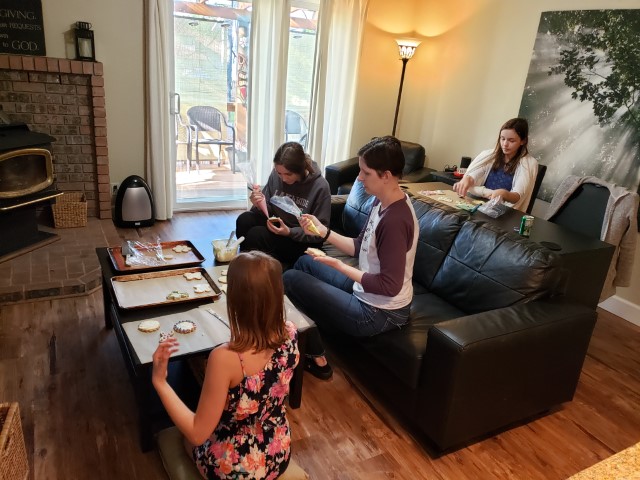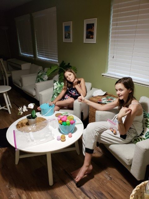 Coloring eggs to put in the front window Front window decorations Someone thought all our Disney+ accounts should be Frozen II characters I found 2 computers we were not using them and took time to reset them. We gave one away and are using one on our kitchen counter to try and reduce all the little notes of things to do. More bread Roblox….SO MUCH ROBLOX Sage had Tom help her get some chords to a song she wanted to sing and has been practicing it When you don’t have a pool…. First meal on the deck for the season Hydroponic start growing and getting ready to be moved downstairs Sleeping in the tent outside Pizzas in the pizza oven Learning about different knives from Dad while he was organizing Molly and Ashley both grew out of their bikes. We gave them both away and soemone in our neighborhood gave us one the correct size so they can now ride bikes together. (Molly rides Sage’s bike and Ashley rides the new one.) Easter basket – 15yrs. Easter basket – 10yrs. Easter basket – 12yrs. Dying eggs More eggs Big project of the week was the garage. We decided to keep my car out for a while and turn it into a more useful area for us. We organized all the drawers, shelves and cupboards. Now there is an exercise area and craft area. The “workbench” is now clutter free and just hold the PicoBrew. Outside pantry and kitchen supplies are more organized. Family Easter Picture Church at home. Gathering around the Hymn Book. I love hymns! Decorating Easter Cookies More decorating…. More decorating…. Still more decorating…. Easter Egg Hung after dinner So thankful to be able to do this outside Don’t mind the mess in the background So much candy and money Never too old to look for eggs if there is candy and money involved! Played silly mind games like this on Facebook The girls did a photo shoot one day This might be the only time I saw them out of PJs the whole week!
