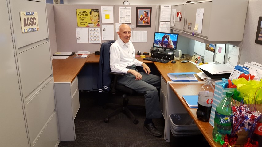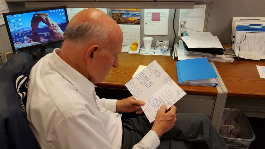 At his desk, reading a card from his co-workers