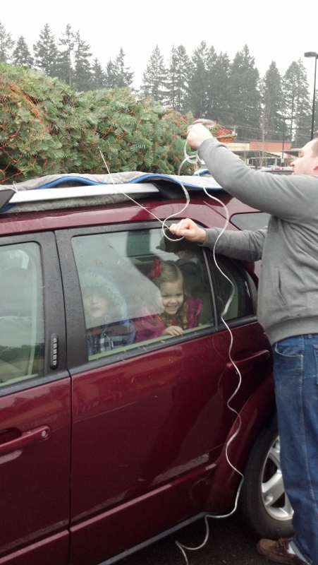 I have no idea why the girls thought it was so fascinating to watch Tom tie the tree on top of the car!