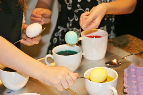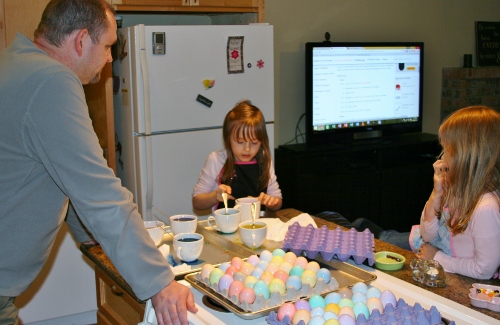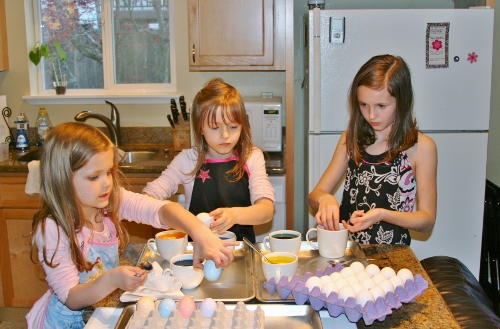 The day before Easter, we enjoyed some time around the house coloring eggs. Apparently they didn’t like my natural Easter egg dying attempt because this year Sage asked me just to buy the dye in a box. So I splurged on a $1.29 box of dye. Lol. We also didn’t hard boil any eggs this year. We only dyed raw ones. 🙂