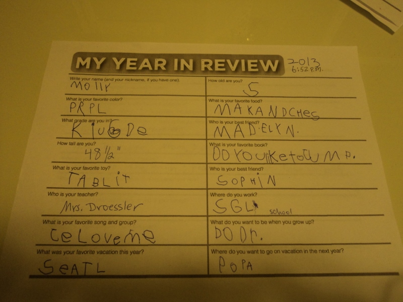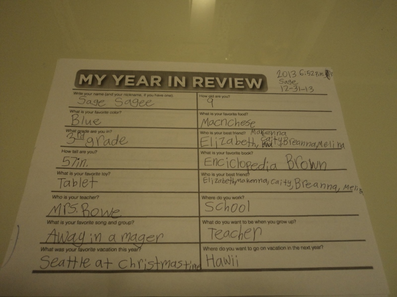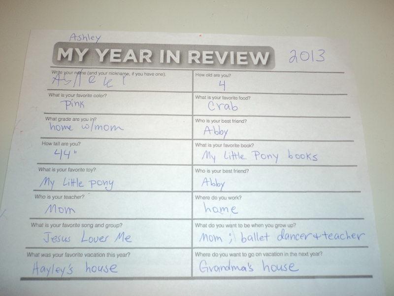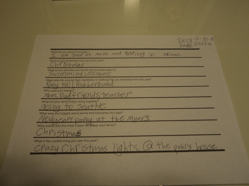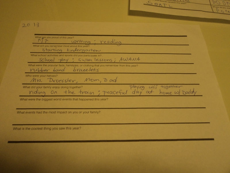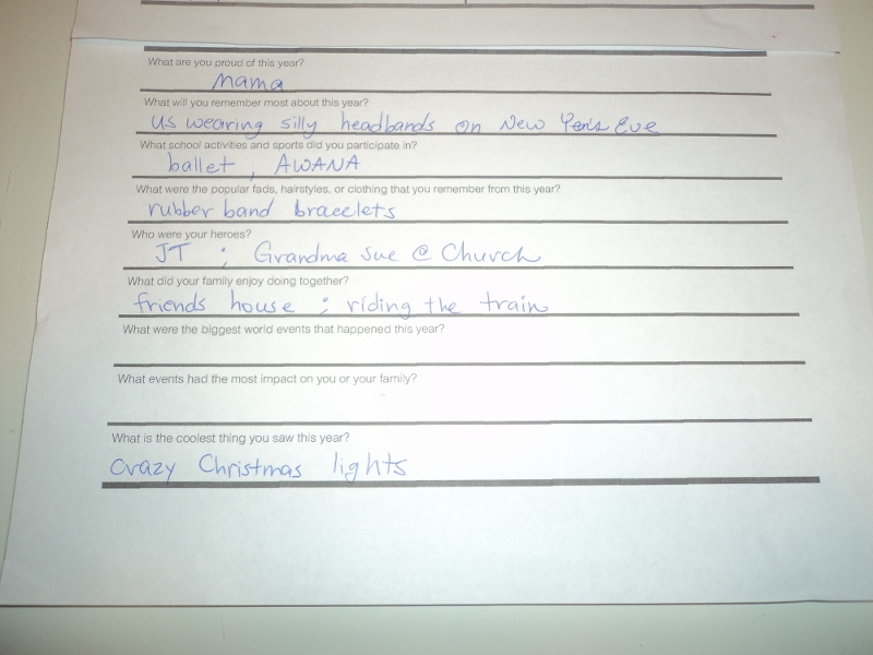 Then the girls each picked a few items to put in a time capsule that will help them remember the things they liked or enjoyed during 2013. We’ll put it up with our Christmas/New Year’s decorations in the attic and will open it next New Year’s Eve.