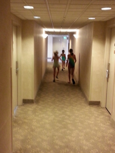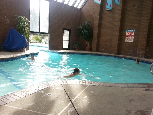 We swam after dinner and then the next morning before we had to check out. And by we, I mean the girls. Tom looked at some magazines and I played Soduku. (The pool was only 3 1/2 feet deep.)