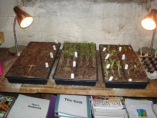 The girls and I started some seeds in some egg cartons but were not getting much growth. So Tom set up a little greenhouse in our basement. He bought a few full spectrum light bulbs and some trays and seed starter. He set a little heater to 70 degrees and 6 days later we have a lot of little veggies starting to grow. This picture was taken on Saturday and they are so much bigger today, 2 days later. Now we just need to get outside and finish prepping the garden to plant. The girls are excited to use all their gardening tools and gloves they got for Easter so hopefully we’ll get out there soon!