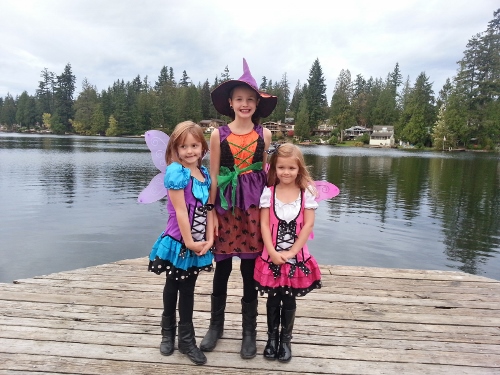 Halloween started for us a few weeks ago with a special package from Grandma and Grandpa. Along with a cut Halloween stuffed animal, they send money for a new costume so out we went to find one. The girls all picked out the same costume in different colors. (And then Sage decided she didn’t want to match and ended up wearing one we already had. I’ll try to get an all matching picture sometime, but for now, you’ll just have to see the 2 faries (or butterlies depending on when you ask them) and a cute witch.)
