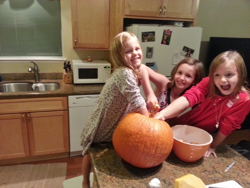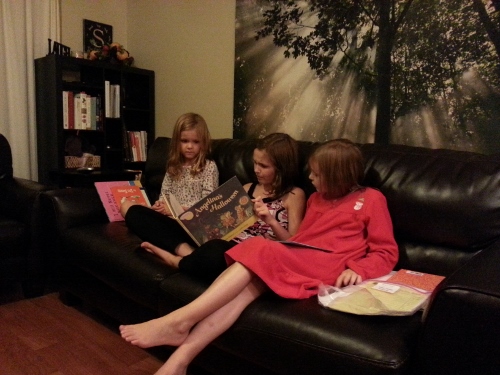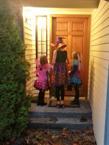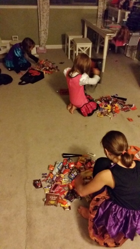 Then on Halloween, Tom and I took them out Trick-or-Treating in the neighborhood. Our neighborhood is FULL of kids, and the girls love walking around and seeing so many friends from the bus and from school. Our neighbors are so kind as they open their door to greet the girls cheerfully. They also give away great candy, pencils, blow horns and snacks. We were out for about an hour and have enough candy to feed a small country.