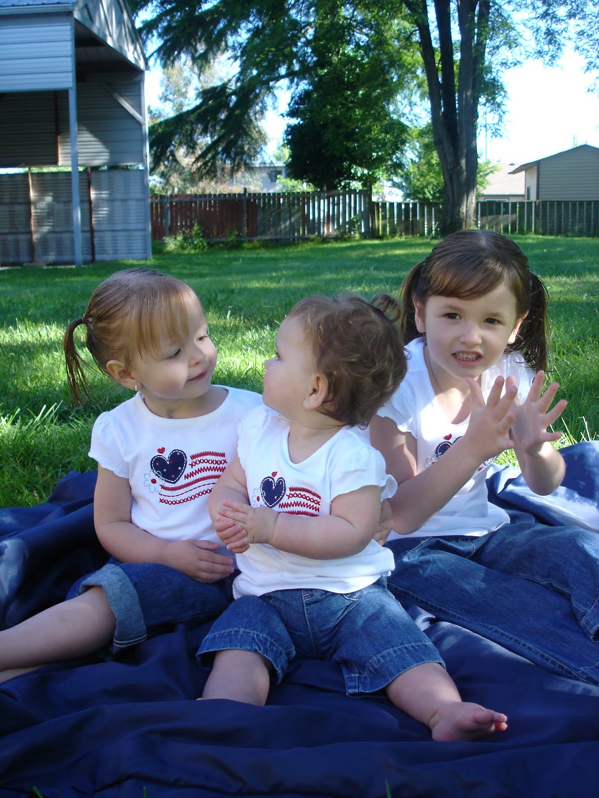 Tom’s Mom sent up some matching outifts for the girls for 4th of July so we attempted to get a picture . . . here are a few good ones. Molly – 2 1/2, Ashley 10 months, Sage – 5 1/2