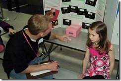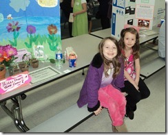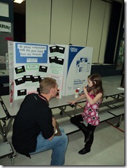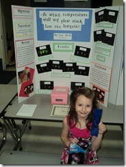 At the science fair this morning, she explained her project to the judge and to other adults and kids that were there. She was very proud of her work and she was so cute and very grown up looking to us!