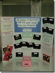 Sage has been working hard this past week on her science fair project. She decided to answer the question, “At what temperature will my glow stick last the longest?” This is a great question for her, because every time she gets one, she wants it to last overnight. We’ve always heard to put it in the freezer, but tried some other temperatures as well to see if that was really the best way to get it to last the longest.