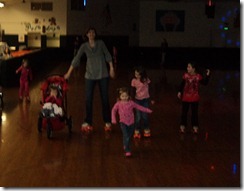 We met Sage’s friend Makenna and her mom there and Sage loved learning to skate. They tightened the wheels on her skates so she didn’t slip all over the place and at the end of the hour, she was doing pretty good. Molly tried for a few minutes, but was scared and ended up walking around holding on to the stroller. Tom and I enjoyed skating as well (and I’m glad I had the stroller to hold on to since it’s been a VERY long time since I’ve been on skates!) Sage is already asking when we can go back again.