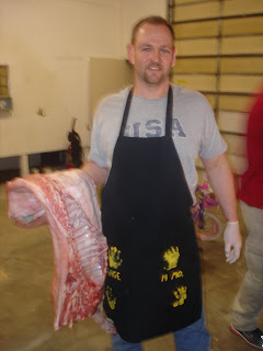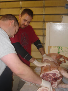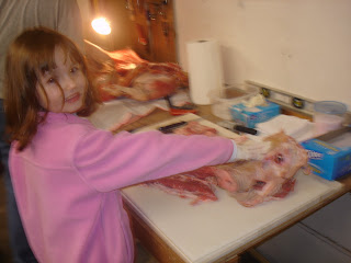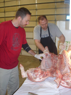 A few weeks ago, Tom and his friend Marcus orered a whole pig from one of their suppliers at work and on their day off, cut it up for us to eat.  They did it at our house, which was great, so the girls and I could see the process as well.  Tom smoked some of the meat and also cured some.  We love having all the meat in the freezer ready to go.