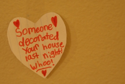 Sage had stayed awake later than us last night (which happens quite often), and put hearts up all around the house.  What a fun surprise!  The “whoo” was our favorite.  🙂