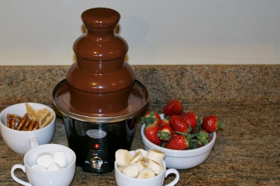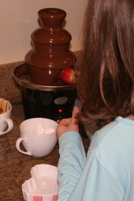 For dinner, we enjoyed cheese fondue and then a special surprise – a chocolate fountain!  I was a bit nervous that it would be a flop, but it was so easy and was SO MUCH FUN!!  The girls were very happy to hear that it was reusable and that we could do this again!